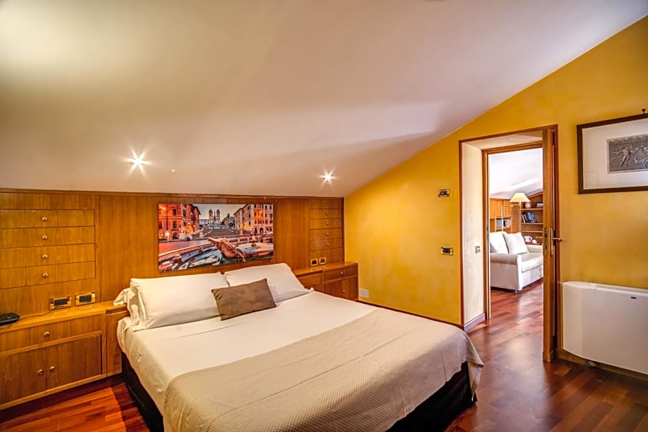 Featuring a charming private livable terrace, our Suite is a cozy nest with characteristic sloped ceilings and wooden floors. It also offers a sitting room with wooden decorative wall panels and shelves, private bathroom with shower and free toiletries, WiFi connection, air conditioning, flat-screen TV with satellite channels, tea&coffee facilities (electric kettle) and mini-bar.